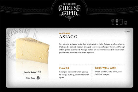 Launched by the Wisconsin Milk Marketing Board the website is simple but well developed and, most of all, extremely useful. Since they started with the idea of Cupid and Love for Cheese, I think they could have dared doing something more, especially in the introduction to the experience.