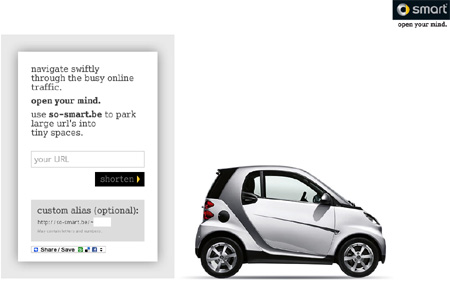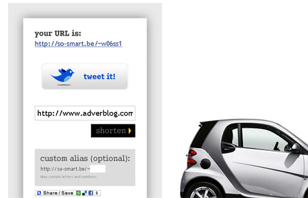 Smart car and tiny url, what a perfect combination. Doesn’t hurt to get on the Twitter bandwagon too.