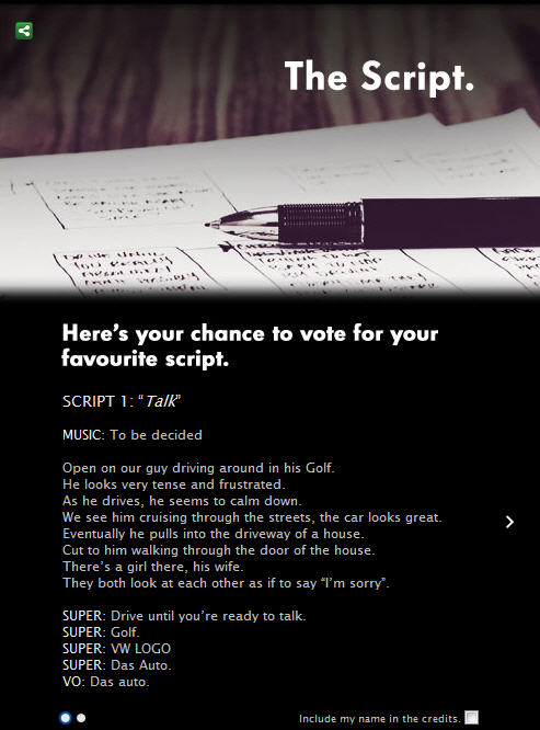 Volkswagen in Canada have come with an idea to use one of their facebook fans to be the creative on the next TVC they produce. They’ll get to pick the script, the car, the cast, add music and edit the spot. They will also be featured in the online credits. From reading some of the fan posts they also have some nice ideas…