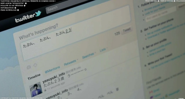 Yasuyuki Okamura, singer & music producer, just launched his official website in time for new album release. On the homepage you can see the opening movie, produced by interactive visionary Yugo Nakamura (Yugop). The lyric has less meaning but sounds like fun, and the way of expression is quite unique.