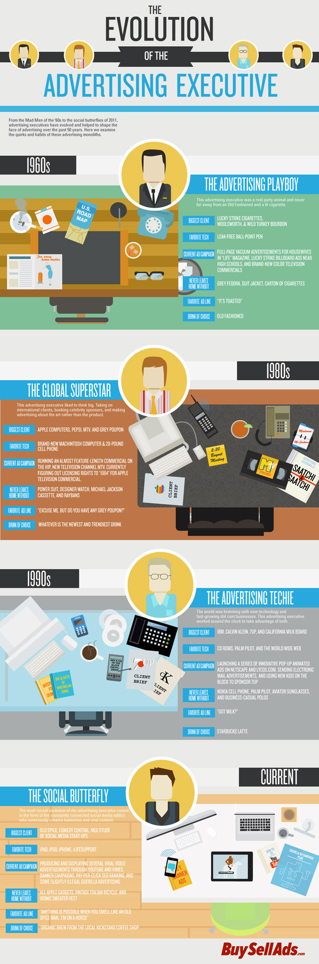 Donald Draper has become a reference for most of us to refer to the Golden Age of advertising and the people who wrote the history of advertising itself in the ’60. Fifty years later the advertising world is still alive and kicking, but it now populated by a different species. From playboys to social butterflies, BuySellAds portraits the evolution of the stereotypes in an infographic that is hilarious and absolutely on point.