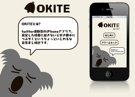 I took this personal. Ever since I moved to the North West of the United States I had to significantly change my habits. No more relaxed 8 AM Italian styles wake ups, my alarm is now set to 6.30 AM and God knows how many times I hit the snooze button. But maybe, eventually, I’ve found a solution to get up straight away. It’s called Okite (which means “wake up” Japanese) and it’s a “nasty” iPhone alarm clock that is connected to your Twitter account, and is programmed to tweet embarrassing messages every time you hit the snooze button.