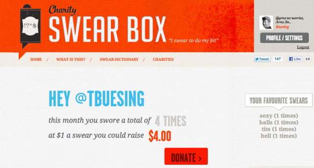 Charity Swearbox is a donation-based site that provides Twitter users with a way to right their verbal wrongs. Log on to CharitySwearbox.com where the app detects all of your recently tweeted swear words, and (multiplied with 1 dollar let’s say) suggests a reasonable donation. Or, if you’ve been good and not sworn at all, you can let rip with a swear-filled tweet right there in the app. And then make up by simply selecting from a list of charities and donate via Paypal.