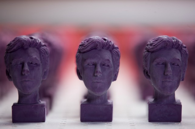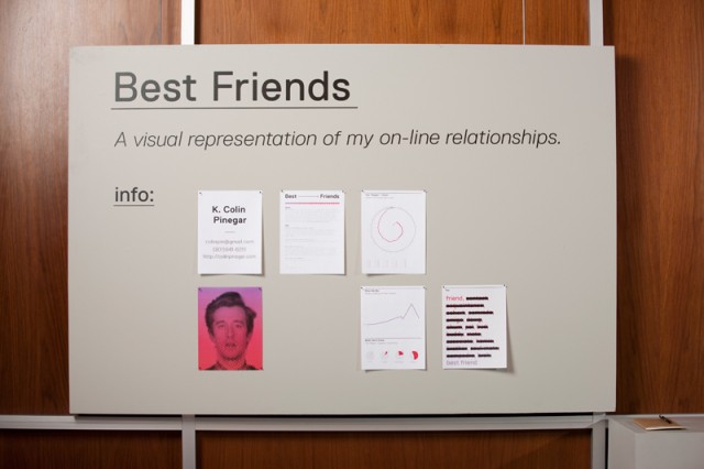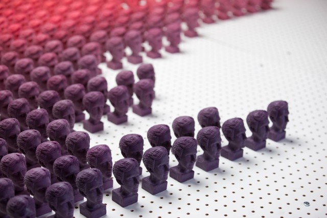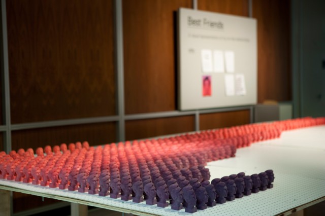 Colin “audited” his Facebook friends and visually mapped out his relationships. He asked himself questions ranging from personal (do I know this person’s phone number?) to generic (can I recognize this person by their name alone?) and assigned each of his cyber-friends a score ranging from 1-25 (those that scored less than 1 were de-friended). Each score was then plotted on a color spectrum. He then made a wax bust of himself for each person in the color that corresponded to their score, purple being assigned the the most intimate friends with whom he interacts in person.