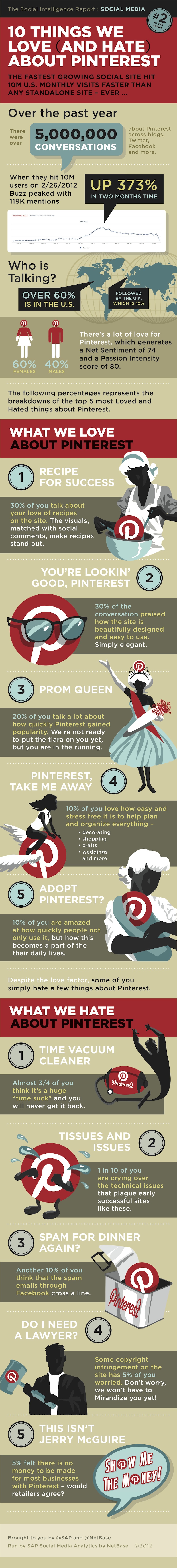 Over 5M impressions from online conversations including more than 2.5M mentions of Pinterest in blogs, news articles, social networks were reviewed. Users of Pinterest who were surveyed came out largely to be passionate and positive (Passion Intensity score: 80 and overall Net Sentiment score: 74).