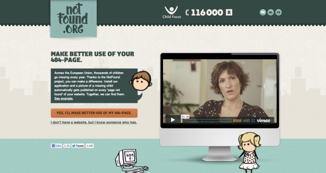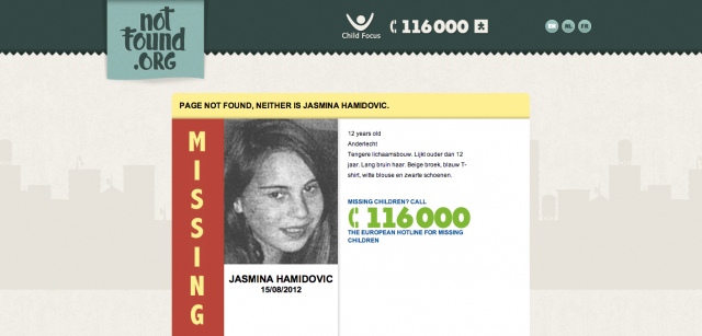 This is smart. Child focus is a public service foundation dedicated to finding missing children. They are inviting companies to put their 404 pages to good use and display missing children (digital) posters instead of the default 404 page. They’ve set up a very simple website called Notfound.org .