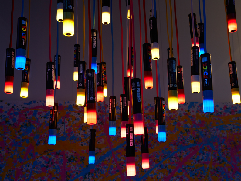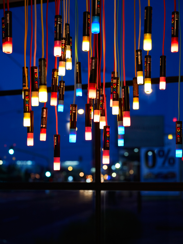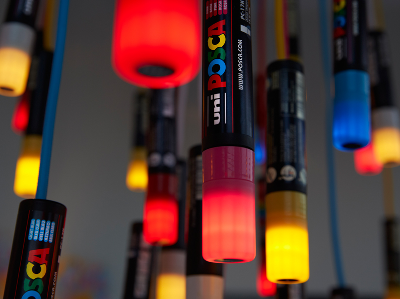 Want one. Advertising creative dude Stephen Justice, in Melbourne has created a fantastic Posca chandelier using, well Posca’s. We all love the pens and now it’s a very cool installation in Melbourne. In all they used forty different markers in 5 colours- Pink, Red, Light Blue, Yellow and White. It has a LED light source, with the lamps sitting inside the marker to make them fully illuminate the Posca’s original colour through the lid from within.