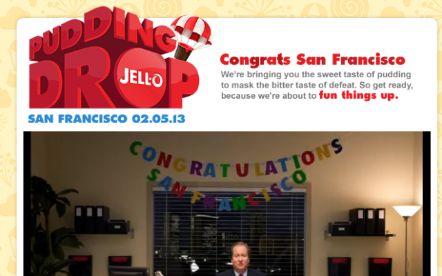 Jell-O has been quick to react to San Francisco losing the Super Bowl by sending a site live less than an hour after Baltimores win. Jell-O will be sending trucks worth of their product to San Francisco locations on Tuesday to cheer them all up. I also love the Baltimore Blocker Chrome extemsion that allows you to block mentions of the Baltimore win buy replacing those images or keywords with anything of your choice - like puppies!!