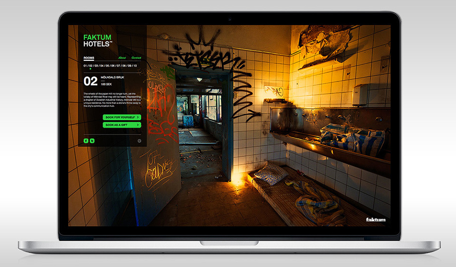 Clever play by Forsman & Bodenfors to promote Gothenburg’s street newspaper “Faktum” through a tongue in cheek online hotel booking platform. They chose ten places where any of the 3400 homeless people were likely to spend the night in Gothenburg – and made it possible to book each place, just like any hotel.