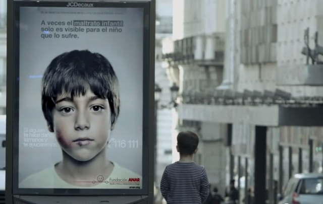 This is a classic poster campaign with a twist. To help children who are suffering abuse, the poster shows a message only visible from a low vantage point.