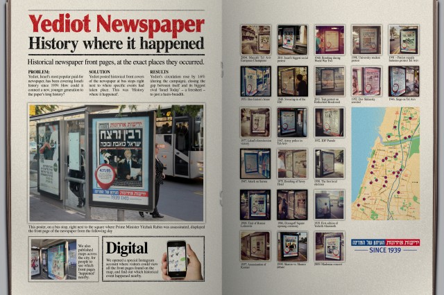 Every newspaper covers major events and creates a documentation, a memory of its country’s history. Israeli newspaper ‘Yediot’  linked the stories they covered and outdoor advertising in an interesting way. Front pages of the past were placed in bus shelters near the places where the events had happend.