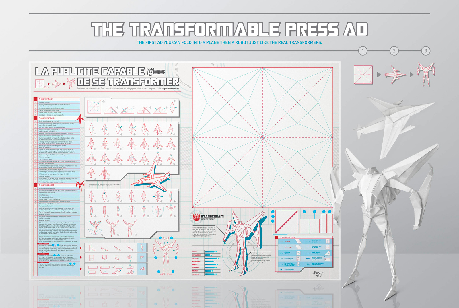 Transformers toys have the ability to transform themselves and become something else to adapt to the situation. For example, they can become a car or a fighter jet. And now also a transformable print ad. It’s a simple, apparently obvious, surely very smart idea by DDB Paris, who worked with paper artist Bertrand Le Pautremat to create the first print advertisement that using the origami technique can turn the magazine page into a robot ready for battle.