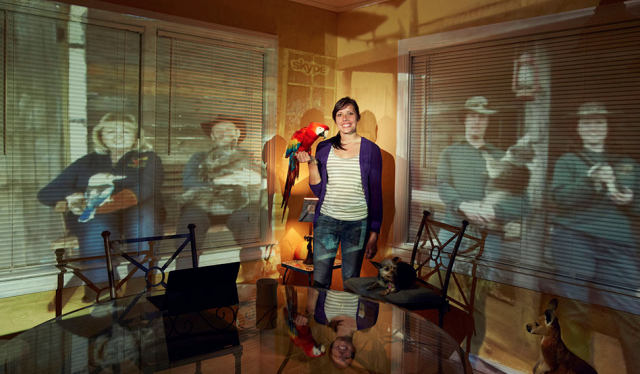 Clang captures each family portrait with a photograph where everyone is able to pose shoulder-to-shoulder…or hand-to-paw, or ballet-slipper-to-sneaker, through a Skype projection on the wall. The result is a uniquely special family portrait that joins loved ones in the real and digital world.