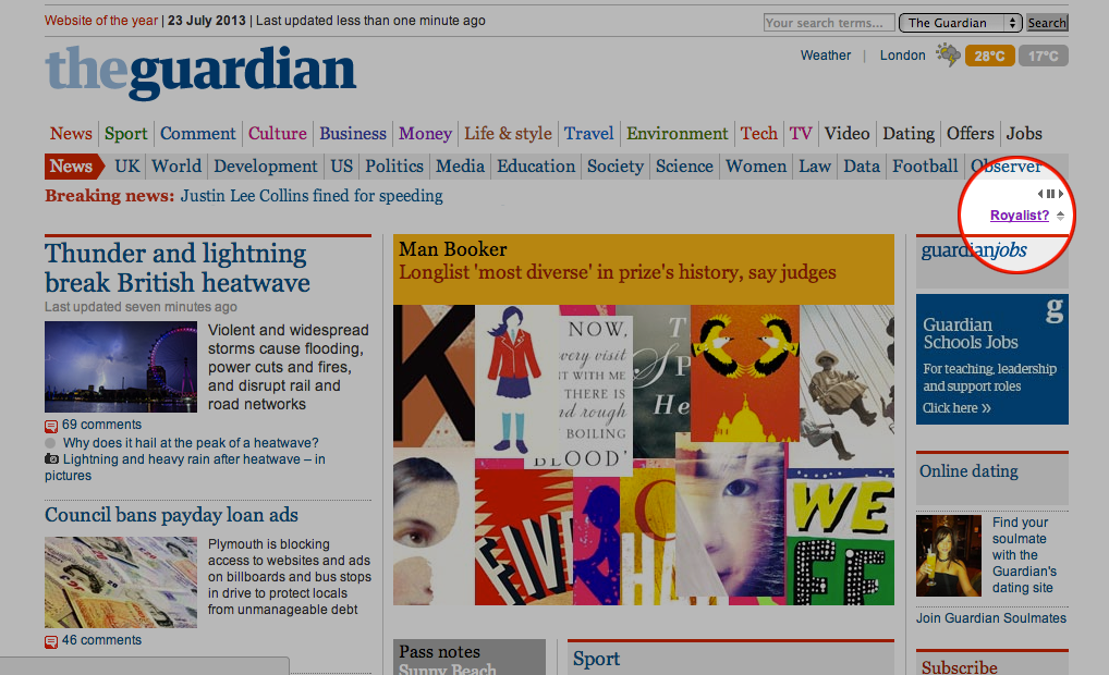 Once clicked, the newspaper filters out all Royal Baby news and displays a ‘Royalist?’ link instead for people to switch back.