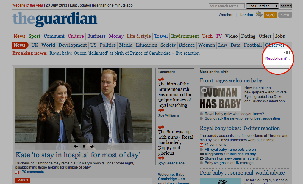 This is the best #RoyalBaby play I’ve seen so far. The Guardian has launched a pretty neat toggle feature that lets people filter out all Royal Baby news. A small text link discreetly positioned just under the nav allows people to toggle between 2 modes.
