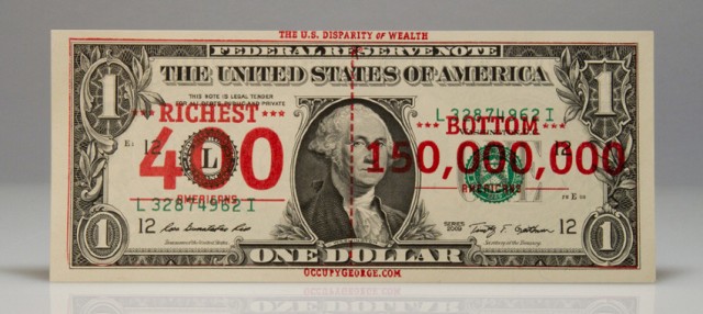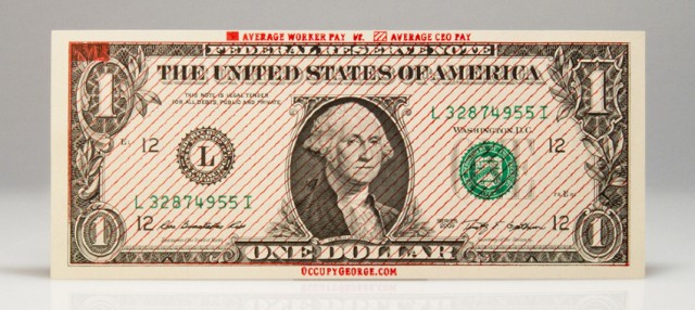 Occupy George. The media choice of the dollar bill is great. Cash stamped fact-based infographics on the money itself circulating the facts around the #Occupy movement.
