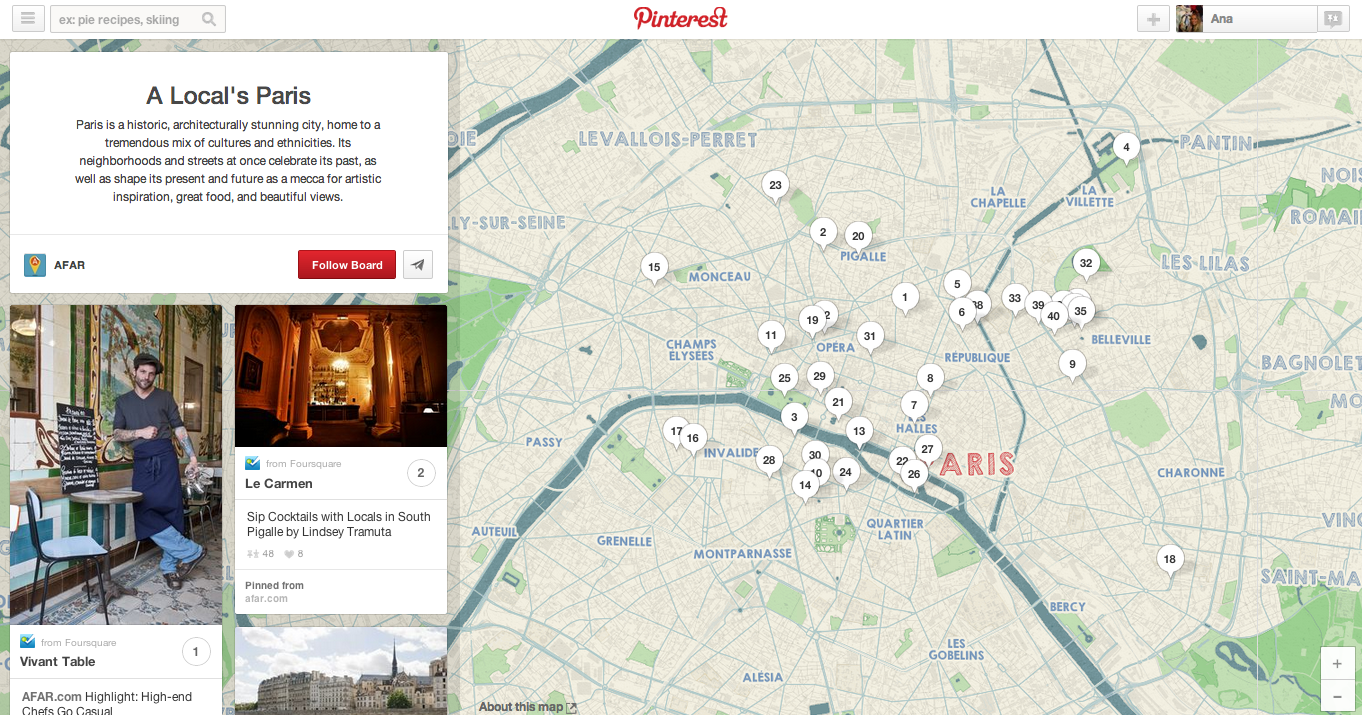 More interesting to me, however, are the partnership opportunities that place pins offer. As of now, Pinterest banded up with Foursquare to use its API (Foursuare allows users lists and also shows them on the map, but information is limited to photos and reviews) and Mapbox, which provided the maps.