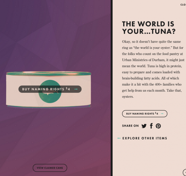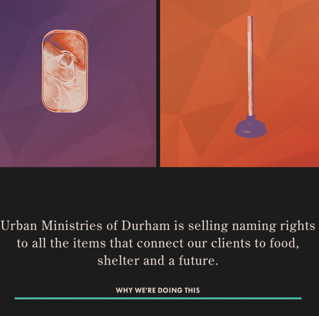 Local homeless shelter Urban Ministries of Durham is selling the naming rights to every item in the shelter - from toilets to teddy bears to cans of tuna. All to help more people get from homelessness into homes of their own. Great initiative and the site is nicely designed too…