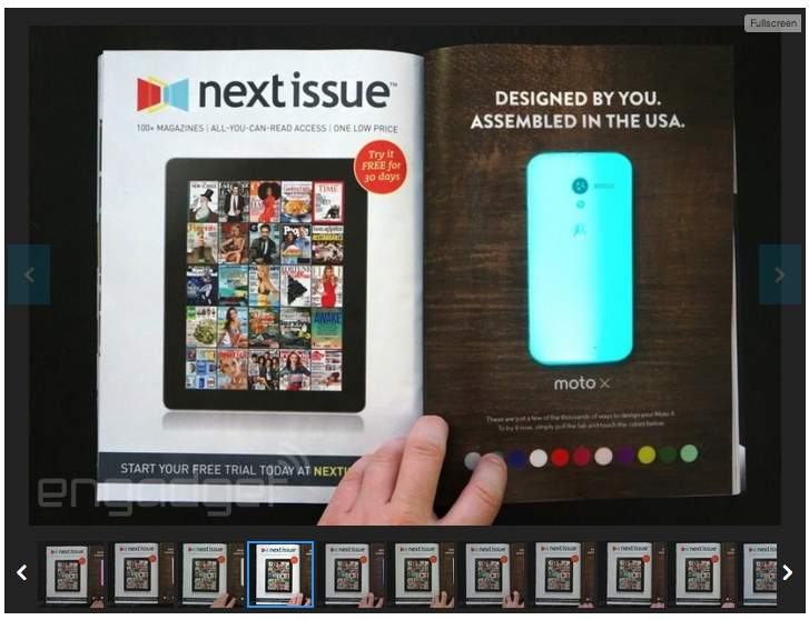 Wired’s January 2014 issue has a surprise for you inside. It comes in the form of an interactive Moto X ad, which enables magazine readers to customize Motorola’s Moto X’s color. 11 LED lights stand for 11 possible phone colors.