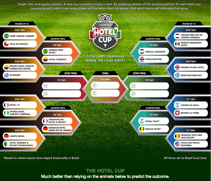 TripAdvisor thinks so. In a bit of genius marketing, TripAdvisor tapped into its own powerful community to predict who’s going to win the World Cup. By analyzing reviews of the accommodations for each team, Trip advisor assesses how ready & rested the players will be for their big games. Called the Hotel Cup, it’s a super-fun spin on the wisdom of the crowds. And who knows, maybe there’s something in it. Sports gamblers, take note.