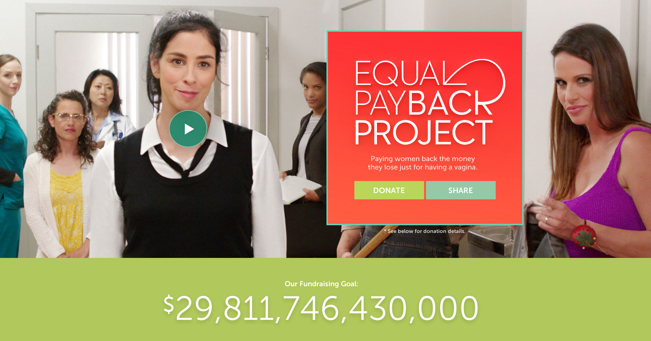 Sarah Silverman self declared “writer, comedian and vagina owner” is back with another provocative (NSFW) video taking on the issue of the gender wage gap. Silverman uploaded this video last week to raise awareness and offer up a few tongue in cheek solutions from gender reassignment surgery through to crowd funding the ridiculously big total amount of the wage gap : $29,811,746,430,000.