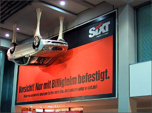 "Sticky" used to be a buzz word in online marketing a few years ago. Now Sixt comes up with a "sticky" idea to promote its rental service in Germany. As you can see from the picture below, the outcome is certainly attractive even if the advertising text could have been better. It says: do it only with a top quality glue (which is not included in our extremely low renting prices).