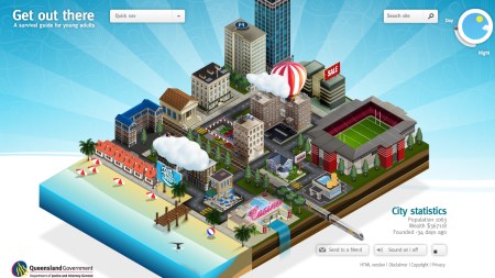 The "Get out there" experience is dubbed "a survival guide for young adults" and it really offers a wide range of information on several different topics (even on gambling!). The site looks really nice and functional only on the homepage (althought not very innovative), then if you browse the second level of content the interface is quite flat, but I don't really mind given the goal of the project that is to inform rather than to entertain.