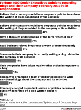 On eMarketer, an interesting analysis on the role of blogs as marketing tools. According to a survey by Harris Interactive "Fortune 1000 business executives are reacting slowly to the idea of corporate blogs as a communications medium."