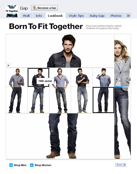 I just stumbled upon this beautiful Facebook app called Lookbook, developed by Gap to promote their 1969 Premium Jeans Collection. Using a simple interface to find the perfect match of your choice, the thing i liked the most was the availability of going to the GAP site in order to buy that outfit that you chose at the Facebook app.