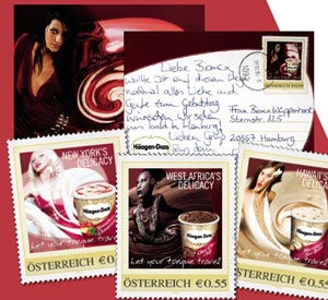From Austria, a series of stamps sponsored by Haagen-Dazs. The icecream brand partnered with the Austrian Postal Service to produc a limited edition series of postal stamps featuring the images of their latest campaign. The idea is of TBWA Germany.
