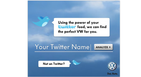 Nice to discover interesting content via Twitter. Yesterday, for example @_RGA posted about this rich media banner that profiles your tweets and gets back to you with the reccomendation of the ideal Volkswagen for you.