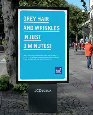 Outdoor advertising invited passers-by to take a picture of themselves with their mobile phones and to MMS it to the pension-provider. A few minutes later AMF sent back a picture showing how the person might look when they are 70 years old.