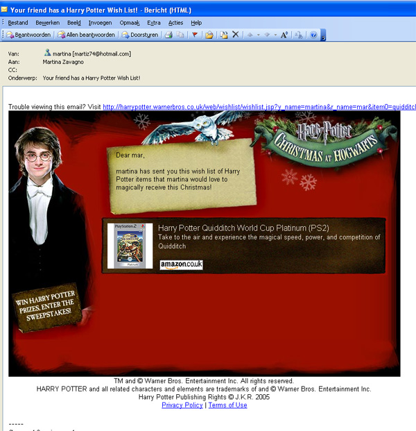 Yahoo! is running a special promotion for the upcoming release in Europe of the new Harry Potter movie (on Nov. 18th). Ads for “Harry Potter And The Goblet Of Fire” are appearing on Yahoo’s homepage in the UK, Germany, Italy and Spain. The Harry Potter movie has its own minisite where users can learn more about the characters, play some games and download screensavers, icons, wallpapers and AOL icons. On the minisite visitors can also create their own Christmas wishlist and share it with friends and relatives. Of course all items are Harry Potter related and are available at popular online stores such as Amazon UK. Unfortunately you need a very good sight to read the tiny text and enjoy the wishlist, but I think this is a smart idea to engage users and generate word-of-mouth not only around the movie but also on the related merchandising. This is an example of the email you receive (click the image to enlarge it).