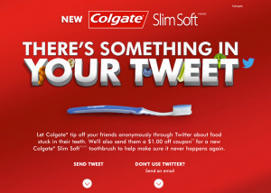 A new service from Colgate that puts Twitter to a completely new use; anonymously alerting people to food stuck in their teeth. Gotta love anonymous!!