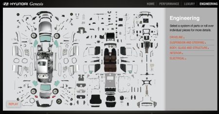 For example, I like the mechanism to spin around the car on the homepage and to navigate the interiors looking for the hotspots to further explore the contents. Also, I liked the section that shows the car completely disassembled, which reminds me of a Honda Ad Cog played in reverse mode.