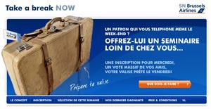 Take a break now (in French) allows people to win a week-end in one of the cities served by SN Brussels Airlines. The game mechanism is really cool: entrants submit their profiles and an appealing presentation explaining why they would like to win. The airline then selects every week 20 entries and publishes the profiles on the site on Wednesday afternoon. And here comes the viral idea: site visitors are asked to vote their favorite profile, therefore deciding who's going to be the winner. In this way the selected people will spread the word about the competition inviting friends, relatives and colleagues to vote for them.
