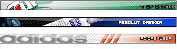 Another way to expressing ourselves via brands is userbars.: They are small graphics for your forum signature, which help you to show a tiny bit of your personality in an attractive way. Example: Let's say you love drinking a 7-up, You are a party-man. And your favorite brand is Adidas. In this case you can express all that in your forum signature by inserting the following bars: